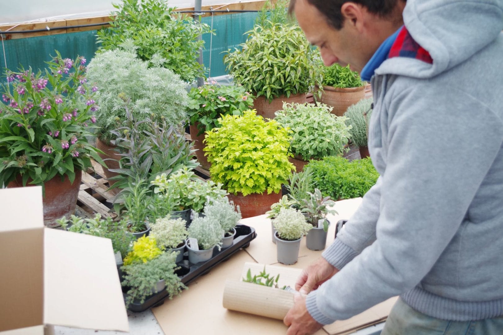 We us recyclable pots, labels and cardboard packaging