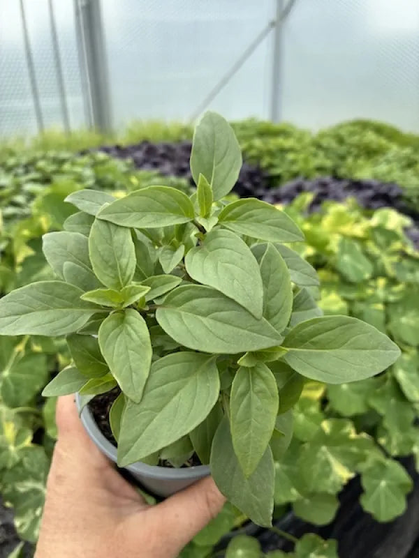 Annual. Prefers sunny sheltered position, in well drained, moist soil. Compact bushy habit. Scented lavender flower spikes. Height 30cm. Use as basil in salads, pestos.