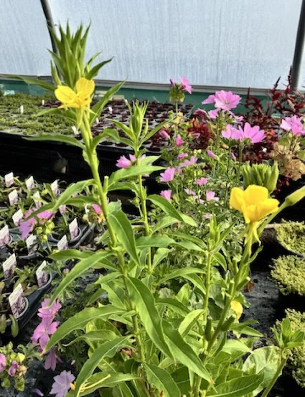 Biennial with lance shaped green leaves and clusters of large bowl shaped fragrant yellow flowers. Strong flower scent is released in the evening. Thrives in poor well drained soil in full sun. Height 1m. Flowers June - September. Many medicinal uses.