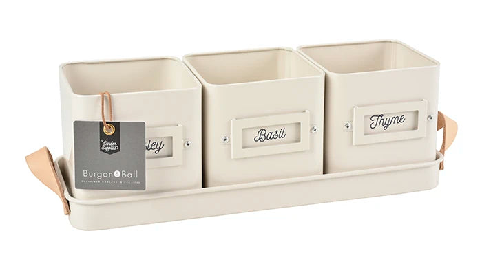 Displayed in a beautifully moulded powder coated steel tray with leather handle. These pots are just the right size to hold our herbs. Stylishly camouflage the plastic pots to offer a touch of class to your kitchen herb display. No need to remove the original pot. Width 41cm, Depth 12cm, Height 12.5cm. Individual pot: 12cm high, 11cm wide, 11cm deep.