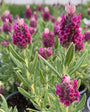 Perennial. Compact and bushy, linear grey-green leaves, early flowering short stalks carry spikes of fragrant deep pink flowers, topped by pink bracts. Plant in well drained soil. Height 20cm.